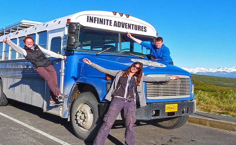 Infinite Adventures bietet Abenteuerurlaub im umgebauten Schulbus. Der Weg ist das Ziel - durch die große Fensterfront und die Plattform auf dem Dach, gibt es die besten Bilder von Bären, Elchen und Co.