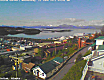 Blick auf Kodiak Stadt mit dem Hafen, Meer und den Bergen im Hintergrund.