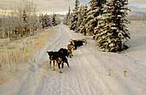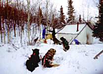 Unterwegs brüllte Steve uns auf einmal etwas zu und zeigte auf einen Berg, auf den es hinaufgehen sollte. Schluck! Nach mehr als einer Stunde war das Ende des Sees erreicht, und wir arbeiteten uns durch das wilde vereiste Sumpfgebiet. Aufpassen muss man hier, da das Gestrüpp sehr dicht ist, und man über all mit dem Schlitten aneckt. Gelegentlich rumpelt es dabei ganz schön, schließlich hat ein Schlitten kein Lenkrad, um elegant um die engen Kurven zu kommen. Später glitten wir durch eine leichte hügelige Landschaft und pflügten die ersten Spuren in den frischen Schnee. Die Berge um uns herum nahmen viel Licht weg, obwohl ein fast blauer Himmel unser Begleiter war. Während der Fahrt packte ich immer wieder meine Minox aus der Brusttasche, um ein paar Bilder zu schießen. Für 3-4 Bilder war die Kamera schussbereit, länger hielt sie den Temperaturen nicht stand. So gegen Mittag machten wir unsere übliche kleine Rast. Schnell wurden einige kleine Äste und Zweige gesammelt, um ein kleines Lagerfeuer zu entzünden. Obwohl alles von Schnee bedeckt ist, fängt das Holz schnell an zu brennen, da es eigentlich knochentrocken ist und keine Feuchtigkeit gezogen hat. Die Hunde legten sich einfach in den Schnee, und so mancher hoffte auf einen Leckerbissen. Die heiße Limonade wurde gerne getrunken, und auf einem Handrost wurden Sandwitches mit Würsten geröstet. Einige nahmen auch das Lagerfeuer zum Anlass, die nassen Arbeitshandschuhe zu trocknen. Es ist auch wichtig, viel zu trinken, denn man kommt schon arg ins schwitzen. Auf eine Wurst verzichtete ich, und teilte sie in 5 gleiche Stücke, die gierig von meinem Team genommen wurden.